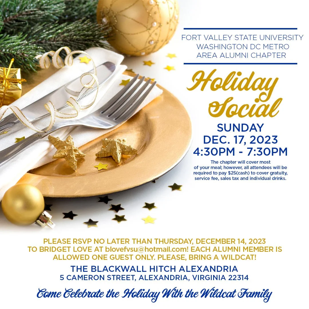 The Fort Valley State University Washington DC Metro Area Alumni Chapter Holiday Social and Membership Drive will be Sunday, Dec. 17, 2023 from 4:30pm to 7:30pm. The restaurant for this year's event will be The Blackwall Hitch Alexandria at 5 Cameron Street Alexandria, Virginia 22314. Please RSVP no later than Thursday December 14, 2023 at Bridget Love at blovefvsu@hotmail.com.